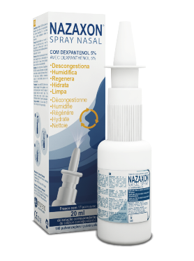 Nazaxon é uma solução tópica para aplicação nasal, límpida e incolor com Dexpantenol 5%, num veículo isotónico. Contém cloreto de benzalcónio como conservante. Indicações: ação descongestionante e de limpeza, assim como efeito hidratante e humectante da mucosa nasal. Precauções especiais: contraindicado em caso de hipersensibilidade ao Dexpantenol ou a qualquer um dos componentes, em doentes com hemofilia e ileus por obstrução mecânica. O conservante pode provocar inchaço da mucosa nasal especialmente em situações de utilização a longo prazo. Dispositivo médico. Leia atentamente a rotulagem e instruções de utilização. | PUBLICIDADE. Divulgação junto do público em geral. Outubro de 2017.