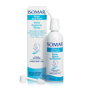 Isomar Spray Higiene Diária é uma solução fisiológica isotónica de água do mar (Mediterrâneo, Cinque Terre, Ligúria, Itália) para a higiene nasal quotidiana e no caso de alergias em geral, incluindo alergias devidas ao pólen. Graças ao seu nebulizador alternativo existente na embalagem, é também indicado para a higiene dos ouvidos. Para crianças e adultos.